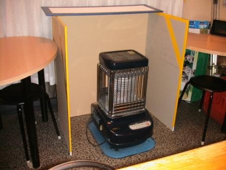 石膏ボードでデカヒーターの囲いを作る。これでワシもヌクヌク。