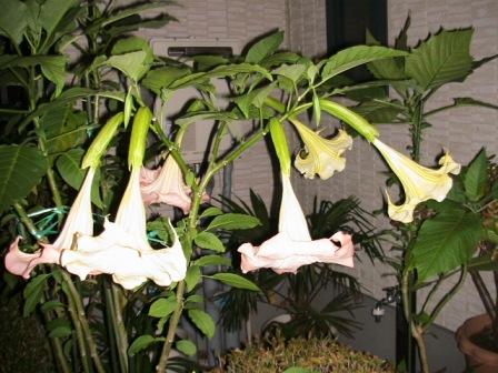 「エンジェルトランペット」一本の枝から6花、蕾3ヶ。