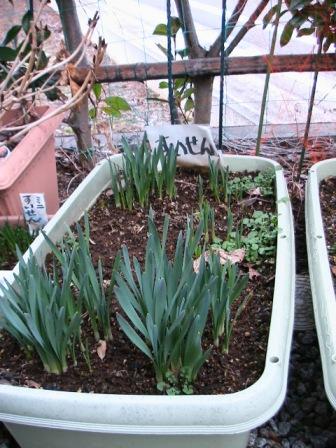 左から・梅が4分咲き、コレチカムーは去年よりはるかに多い芽の横には残雪、サンシュにも新芽、水仙は15センチに。