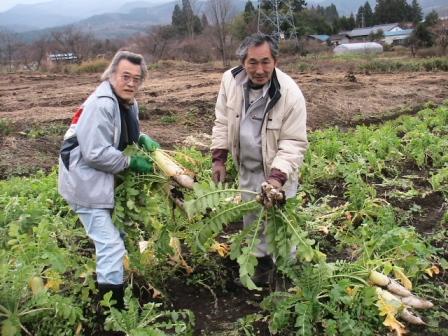 いくらでも持ってゆけと言われたらしいがそうは持てない。K氏の「バン」で行ったので、それでも「白菜30ヶ」「大根・3種20本」等戴いて来て皆さんで分ける。