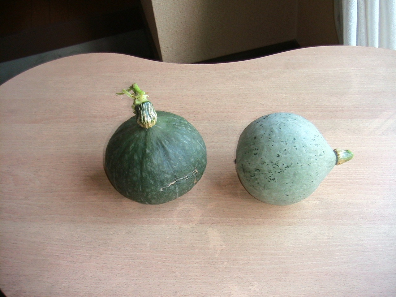 裏の空き地の枯れ枝捨て場に種撒きした「カボチャ」、小ぶりながら白・青2ヶ最後の収穫。