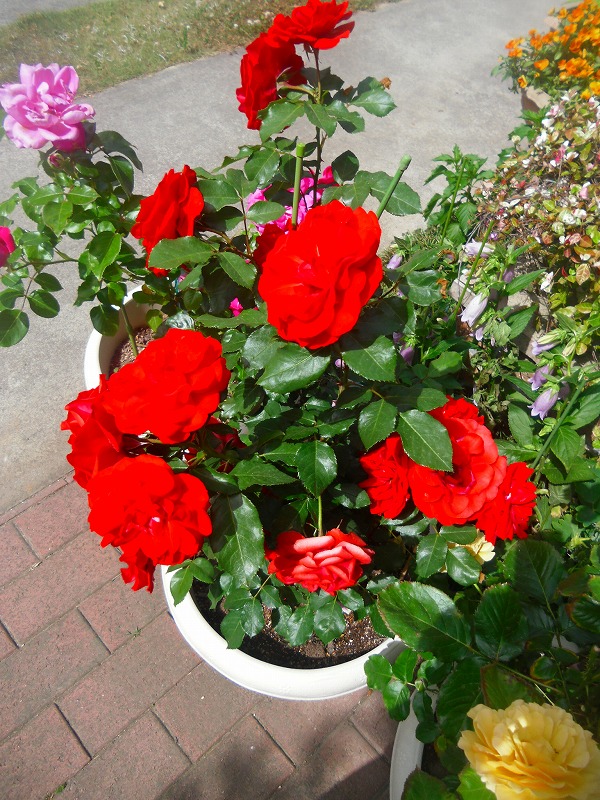 真紅のバラ、この木1本で18ヶの花が、10年ものは除いて四季バラ7鉢7本、ミニバラ6鉢20本の中で記録(左)。