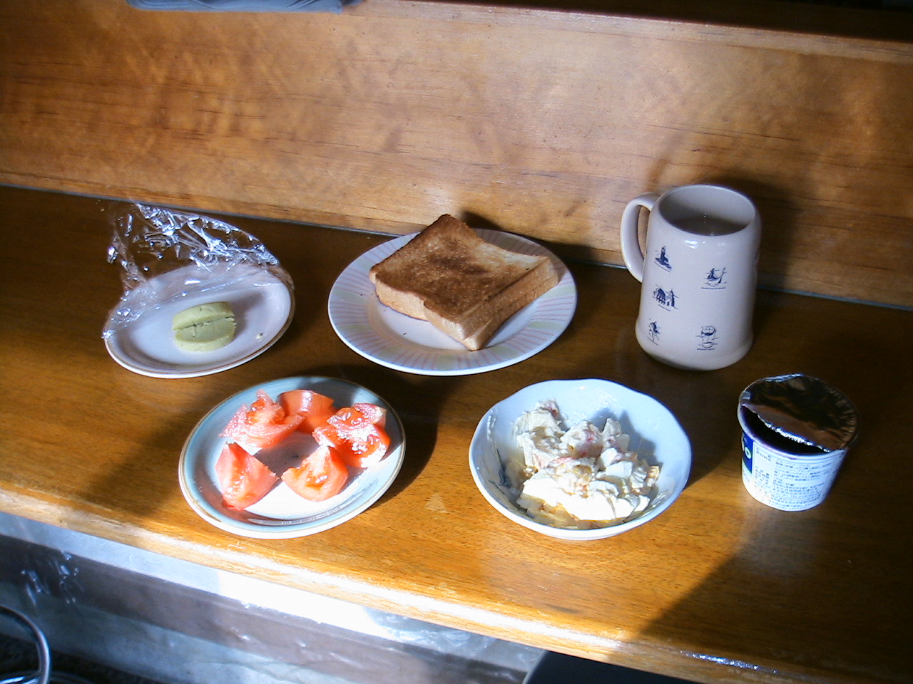 写真・11日の食器類落下と20日の豪華な朝飯。