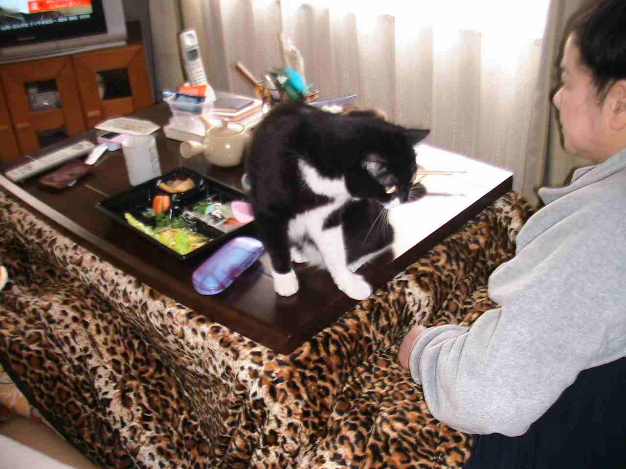 左・新年会のお弁当に入っていた「サシミ」をワシに寄越しなさい!と「二」に迫る。