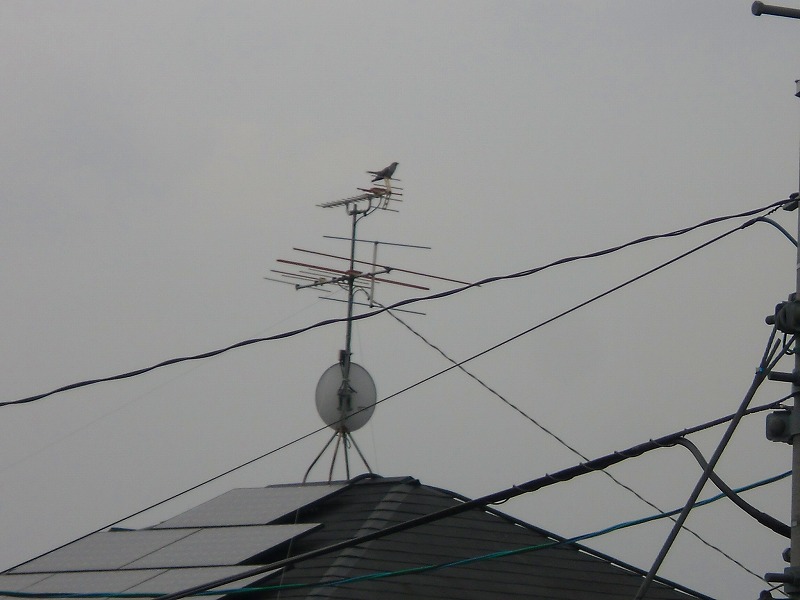 当家南西向いのアンテナに「カッコウ」、「♪静かな湖畔~」ならぬアンテナ上で「♪もう起きちゃいかが~」と。