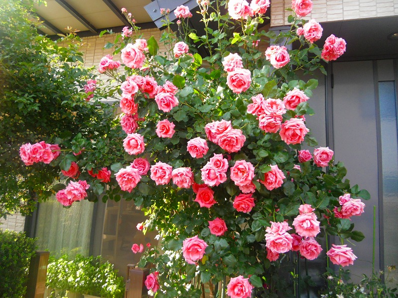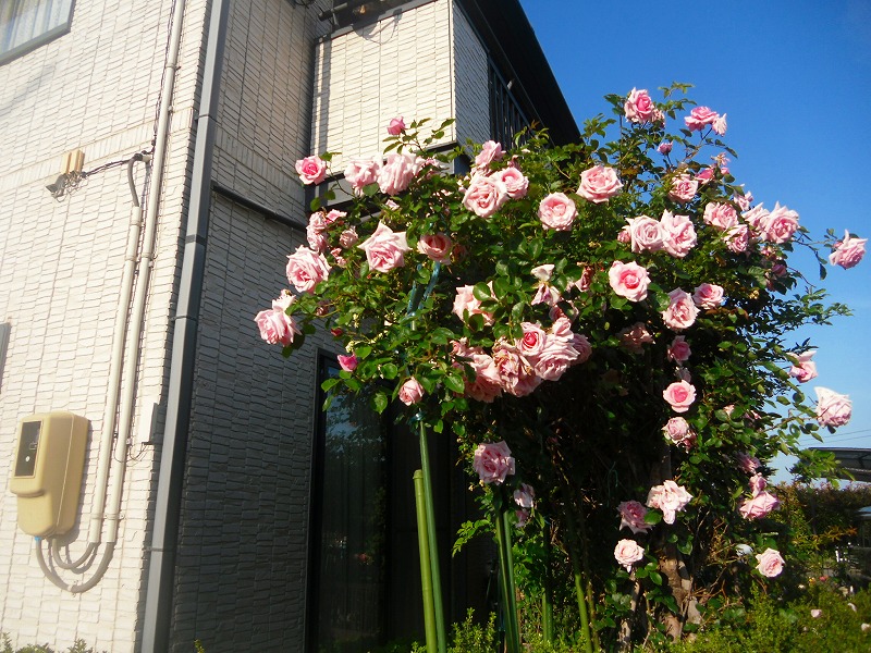 下は2メートルに伸びたバアサンの10年四季バラとこれまたベランダまで延びたツルバラの手入れには脚立が必要。