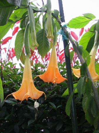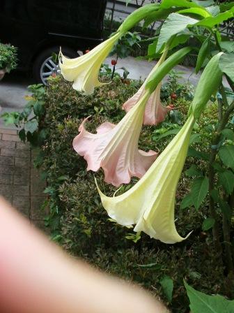 「エンジェルトランペット」一本の枝から6花、蕾3ヶ。