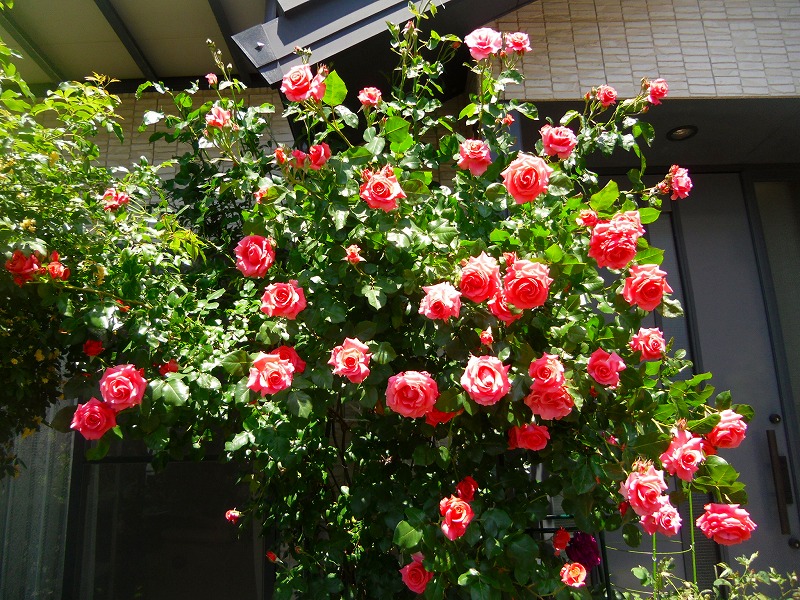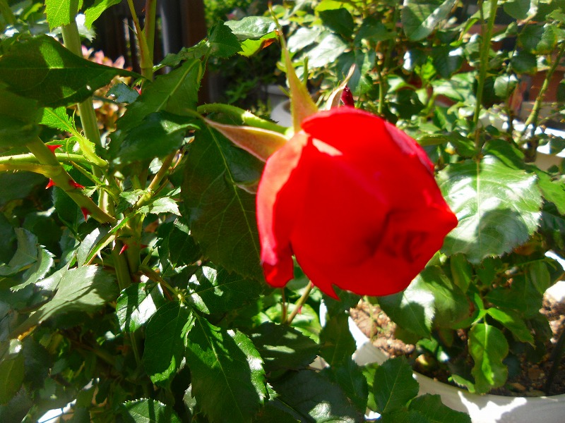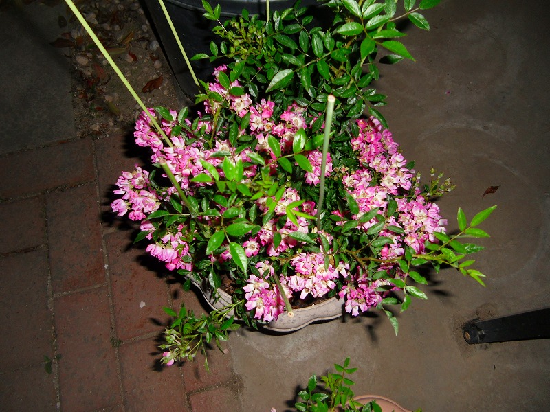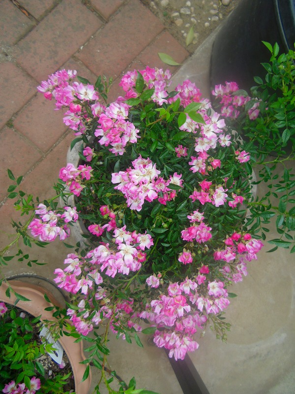 ミニバラ「ミヤビ」8分咲き。新芽に蕾。