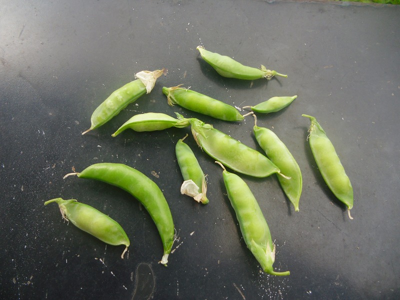 生垣下「マツバ菊」横の「功一農園の収穫・キヌサヤエンドウ」、実の方が「二」の体型みたいにプックリ。