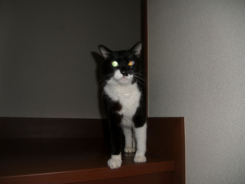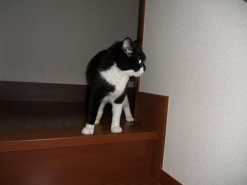 階段の上で「抱いて降りろ!」と待つわし2態。久しぶりに2枚。