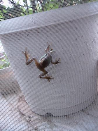 今朝、網戸に2センチ程の「アオカエル」がヘバリ付いていた。ホント、「ヘソ」は無かった。左。