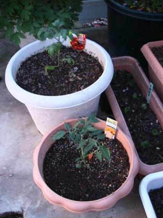 帰宅後直ぐ「一」は大きめの鉢に「中玉・赤」「ミニ・黄」を植えた。左。