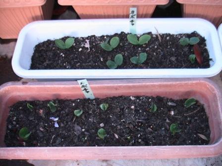 写真右・プランタンに植えた猪苗代の「甘味カボチャ」芽を出す。もう少し成長したらK氏の畑に移植させて貰う。