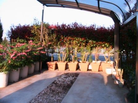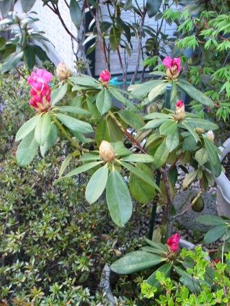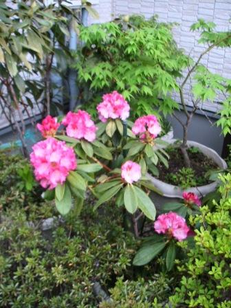 中・1鉢12花が咲いた「石楠花」。奥は「モミジ」が2鉢新葉の緑が綺麗。手前には「ドウダンツツジ」の白い小さな花。「ツツジ」のピンクの花芽が無数。
