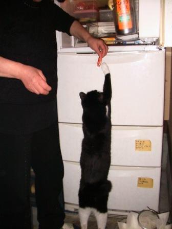 右・カニカマを「早くよこせ!」と冷蔵庫に手を付き立ち上がるワシ。