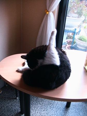 左は我輩の得意のポーズ、片足上げチン舐め。