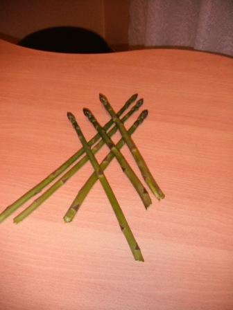 3年越しの「アスパラ」初収穫。細くて可哀相だが6本捥ぐ。右。
