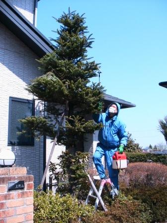 「家臣一」は「もみの木」に虫がいるとの報告で「完全武装」で脚立に上がり「噴霧器」で薬剤噴射、とカット。右。