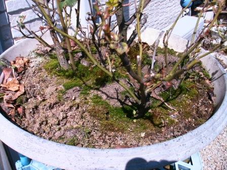 ミニバラの根元に「家臣一」の好きな「コケ」が。