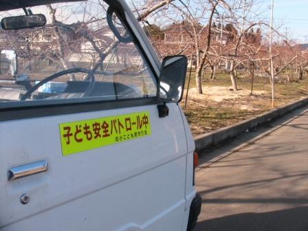 道中写真右の「子ども安全パトロール」のシールを張った荷物車が堂々と「歩道」に駐車。