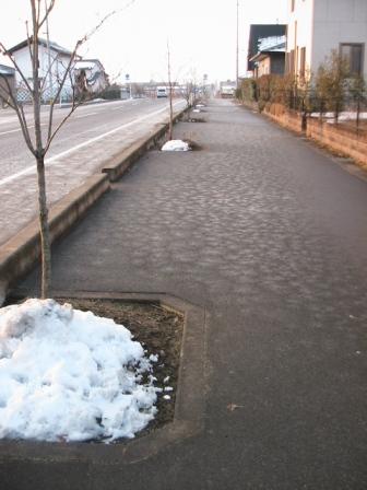 写真左から・連日の寒さだが昨日はお日様。しかし道路は凍っていて綺麗な丸模様、残雪もある。