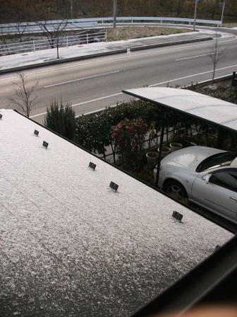窓から下界を見ると屋根、道路が白い。寒くて寝ていられん筈