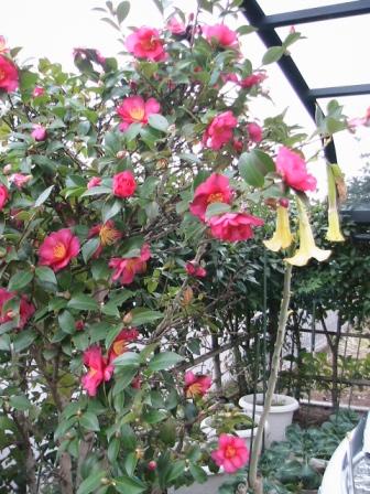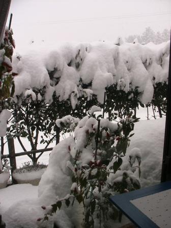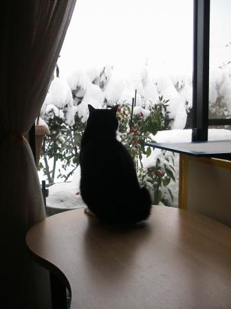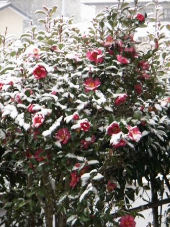 昨夜半の雪は積もらず。朝からの降雪は積りそうな勢い。10時現在「山茶花」の花が隠れそう。右。