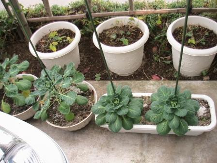 写真右は大きく成長した「芽キャベツ」。このまま冬を越し来春実を付ける筈。