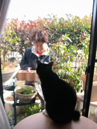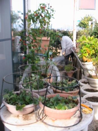 女房は「七色トウガラシ」の「鉢植え替え」作業。