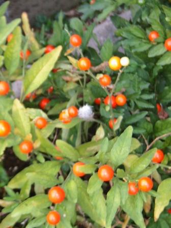 右・「フユサンゴ」の実を雀の3倍ある鳥が来て食べてしまう。中ほどの白いものは残していった鳥の胸毛。10鉢有るからいい様なもんだけど「糞」をいたるところにたれて行くのが気に食わん。特に「ポスト」の上。