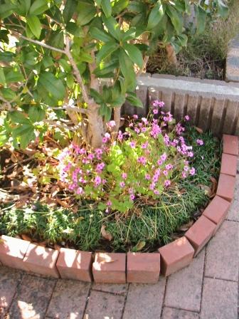 駐車場入り口「金木犀」下の雑草に近いが可憐な紫の花「オキザリソウ」良く咲いてくれている。