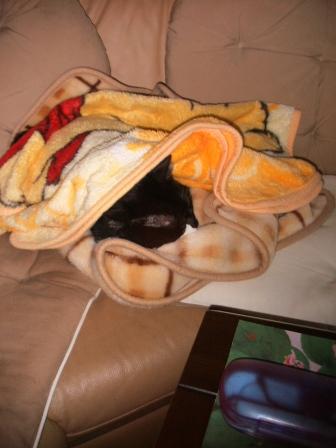 本日は台風の余波か気温低く、と言っても平年並み20度だが、殿様は毛布に包まってオヤスミ。右。