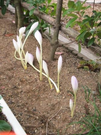 右・葉が枯れて一ヶ月たってから花が出てくる「コレチカムウ」。写真では色が出ていないが薄紫。