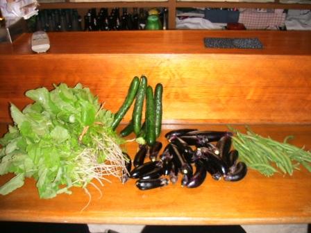 左から、「オロヌキ大根ー間引き大根」「キユウリ」「茄子」「さやいんげん」。