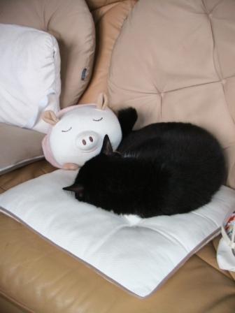 写真は女房、イヤ「豚のヌイグルミ」と仲良くオヤスミ中の殿。