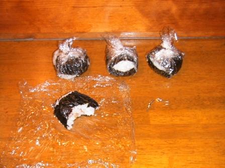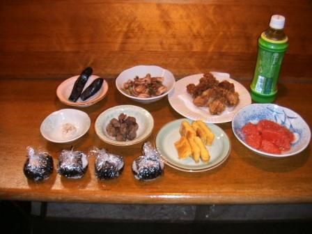 梅干し入り一口おにぎり・から揚げ・シオカラ残のゲソとキャベツの炒め物・卵焼き・鳥モツ(ハツ・レバー・砂肝)煮つけ・義母製ナス漬物・数の子ワサビ・グレープフルーツ半ヶ・お茶。写真は二人分。