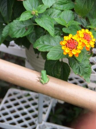 手すりに止まった「アオカエル」2センチ、一番のチビ。食料が多いのか家の周りに数十匹いる。右。