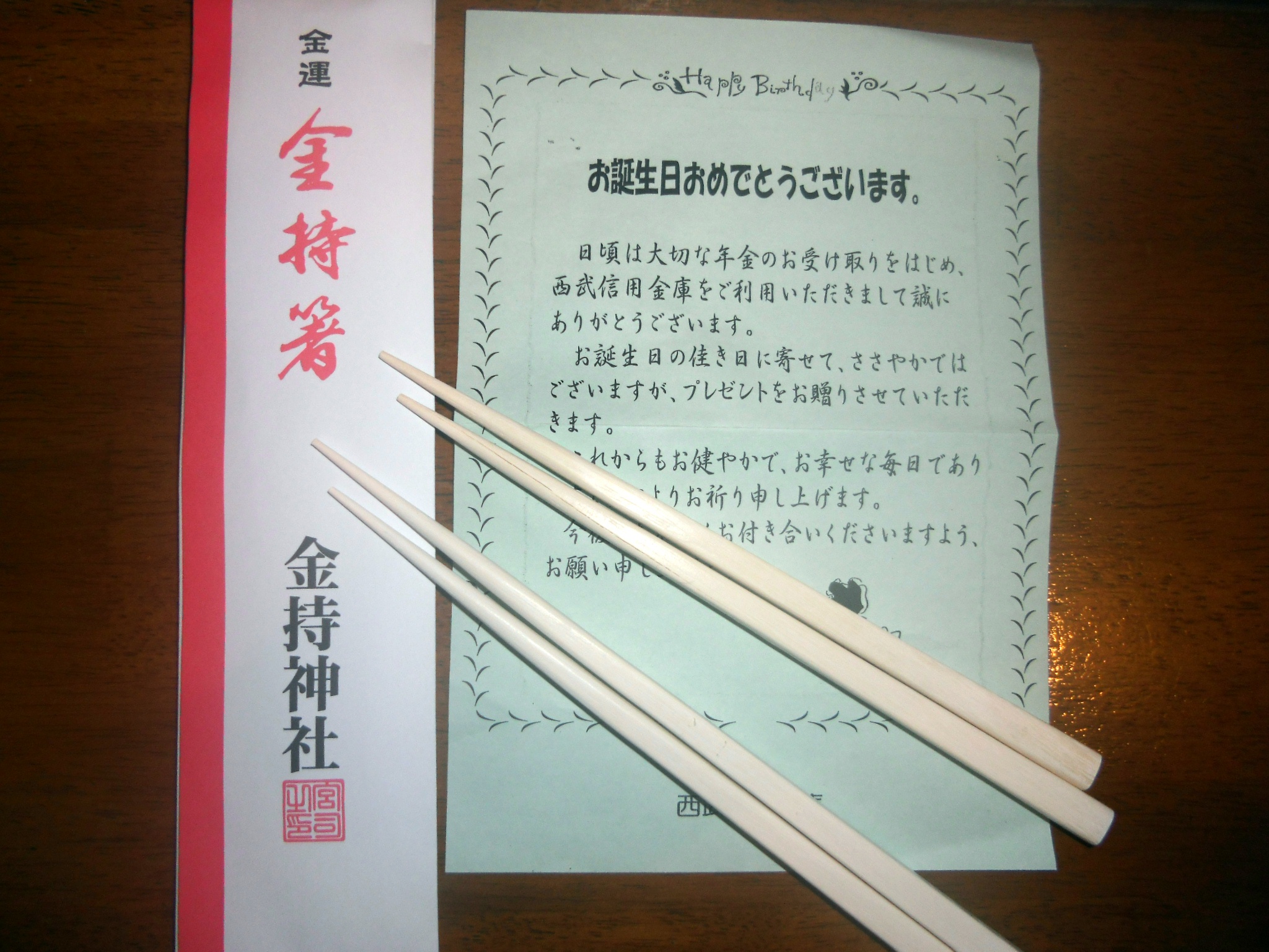 東京のS信金から誕生日祝い「夫婦・金持箸」。