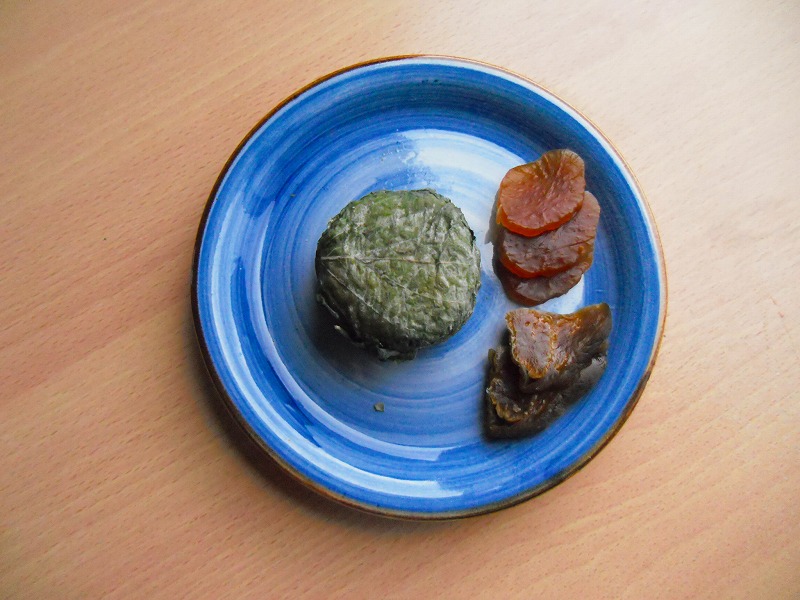 写真は「一」の昼飯、この2日ほどお気に入りで食している7センチの「塩付け大葉包みオニギリ」1ヶ。昨日は2ヶ。