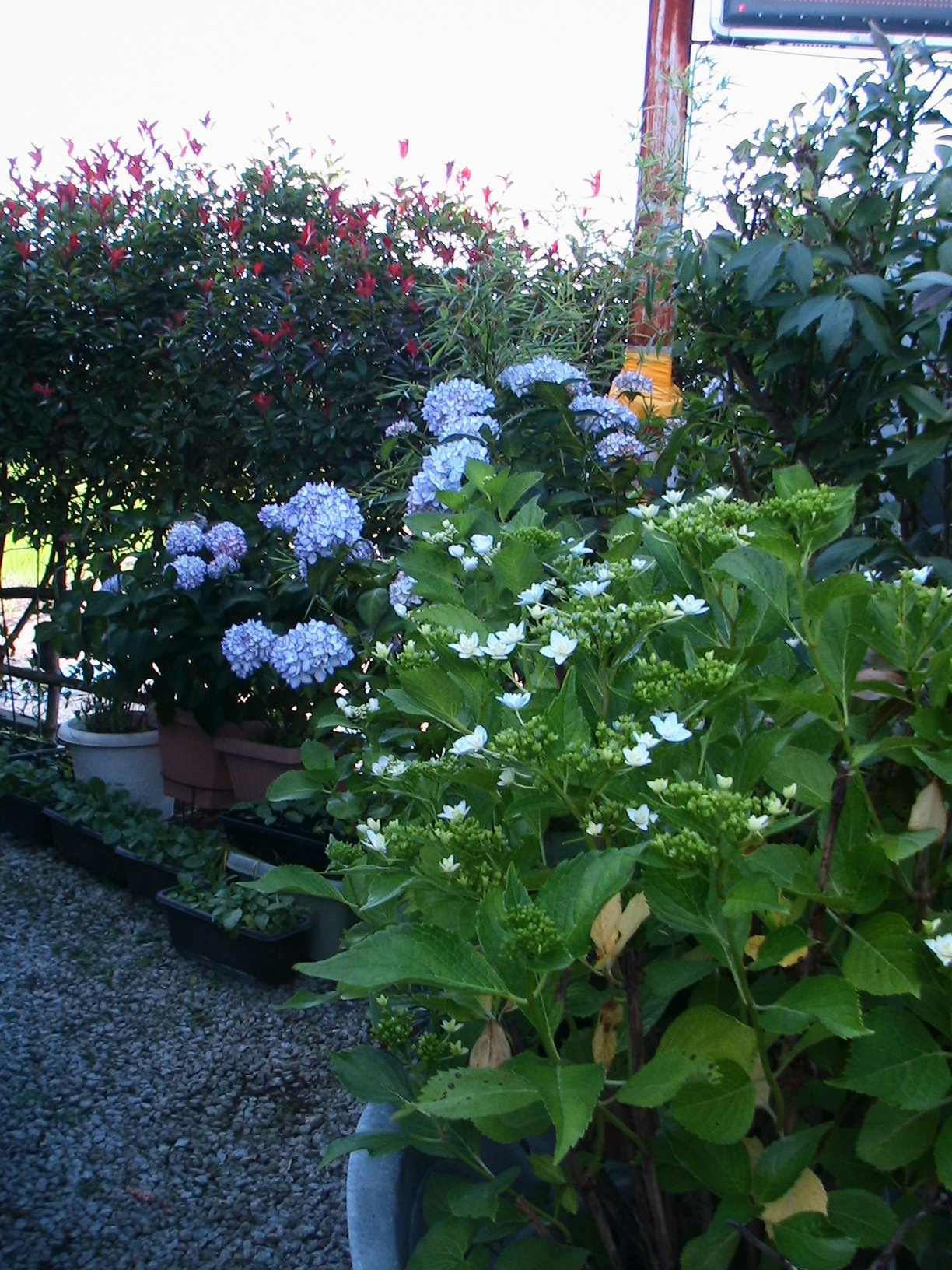 アジサイ2種6鉢、オソマキながら4分咲き。