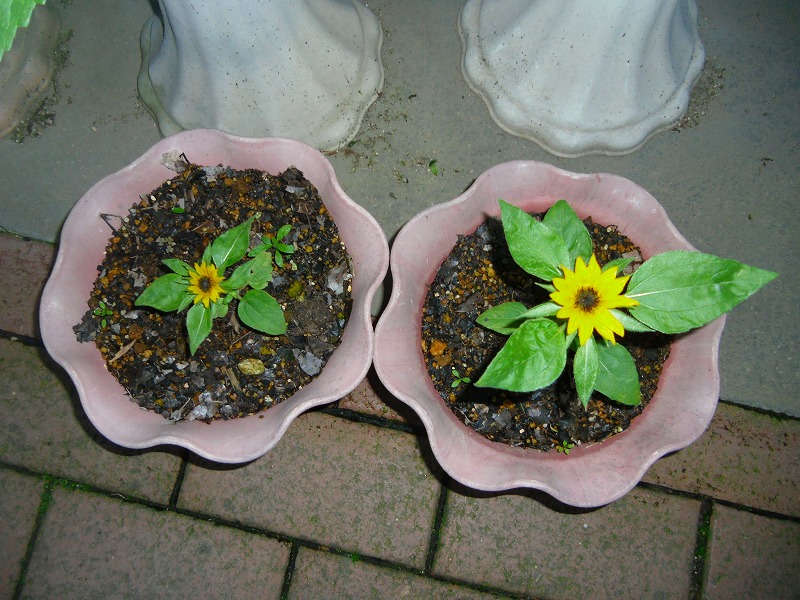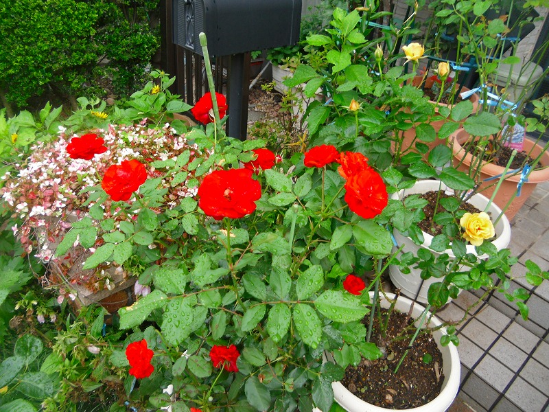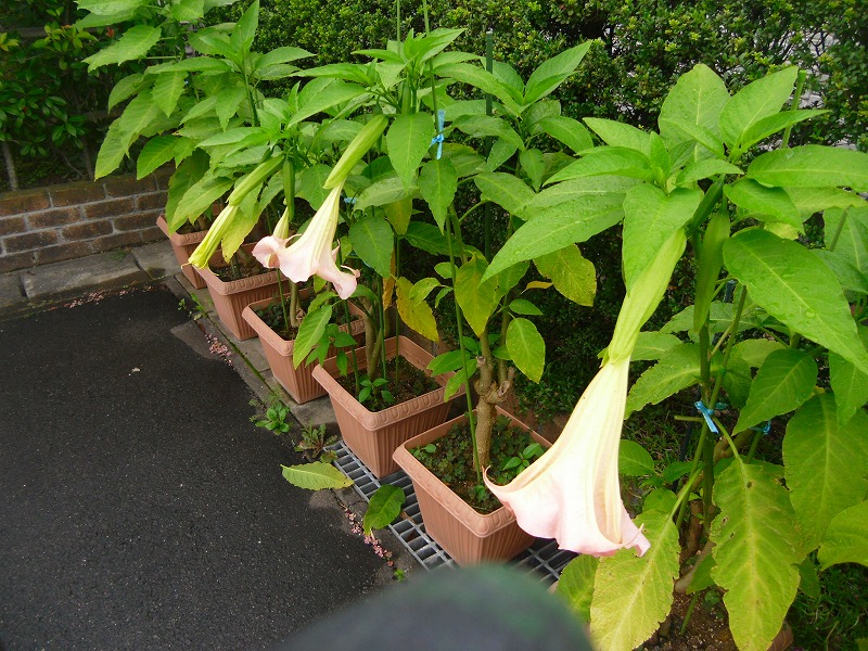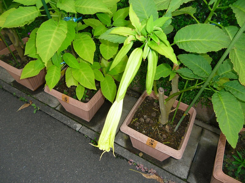 黄色「エンジェルトランペット」が一輪だけ蕾の中から花が飛び出してきた。同じ枝にあと3蕾。白は蕾が5ヶ程。